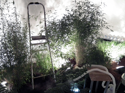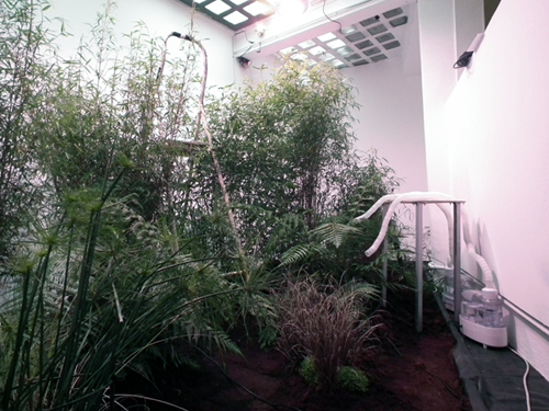 entretenu, et pourtant sous contrôle artificiel. Lampes de croissance et brumisateurs automatiques soulèvent un brouillard rose à fréquence régulière, et participe au rythme des performances.