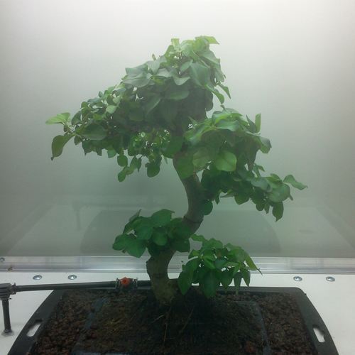 Bois, acier, verre, plantes (Portulacaria alba) lampe à led de croissance, montage électronique, ordinateur, capteurs de montée de sève dit de Granier TDP, amplis, dispositif d'arrosage automatique, haut-parleur.