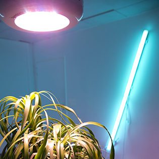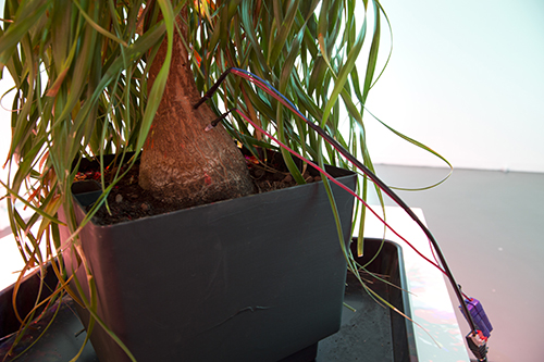 Matériaux : montages électroniques, cables, quatre néons à LED DMX, capteur dit de granier TDP 10, plante (Beaucarnea récurvata), lampe de croissance à LED et 2 impressions sur plexiglass.