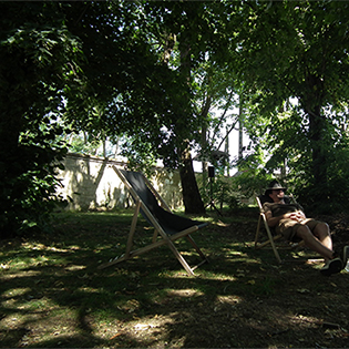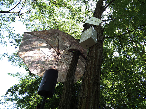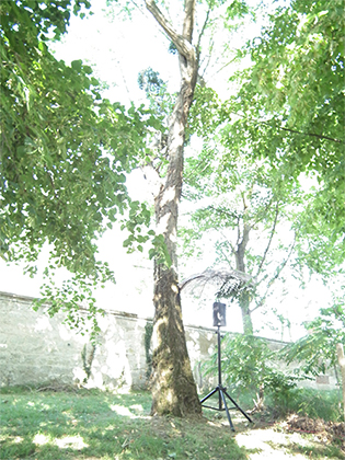 Vue de l'installation, Concerto pour montée de sève, parc du Château Ephémère - Fabrique sonore et numérique - à Carrière-sous-Poissy. LAAB avec Nicolas Bralet, François-David Collin et Sabrina Issa. juin, 2017.