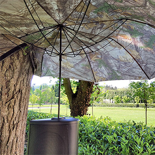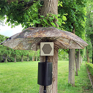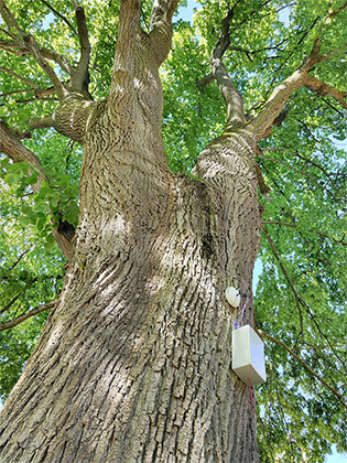 Concerto pour flux de sève, détail de l'installation, enceinte ultra-directionnelle. LAAB avec Nicolas Bralet, François-David Collin et Sabrina Issa. Parc du Château du CNRS à Gif-sur-Yvette. mai 2017.