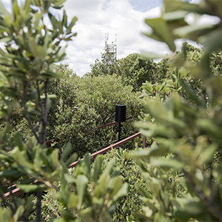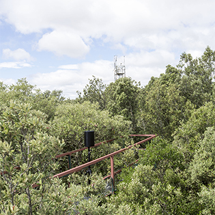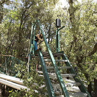 Concerto pour montée de sève, vue de l'installation sonore, Site expérimental CEFE - CNRS de la Forêt de Puéchabon, Hérault. Photo Delphine Chevrot. LAAB, juillet 2017.