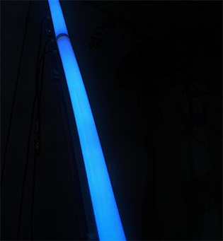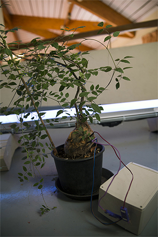 Variation pour montée de sève, est une installation lumineuse dans laquelle est rendu visible sur des néons, la progression en temps réel, de la sève ascendante le long du tronc ou le la tige principal d’une plante. Nous sommes ainsi baignés dans un espace où les changements de luminosités provoqués par la sève sont relatifs au rythme biologique de la plante.