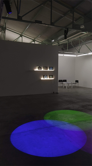 Vue de l'exposition, Trichromatisme, synthèse additive chez l'abeille GBUV (Green / Blue / UV), trois cadreurs couleur programmables, Sabrina Issa, LAAB, Crac Occitanie, Sète 2020.