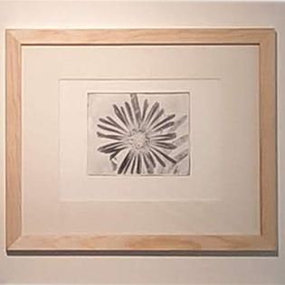 Vue de l'exposition avec au premier plan Senecio sp et Pissenlit, deux tirages lenticulaires de 50 x 72 cm, au second plan, plusieurs photogravures sur papier de soie et carbone, un gauffrage et plusieurs feuilles polymère UV sur aluminium, Espace Jean de Joigny, 2020.