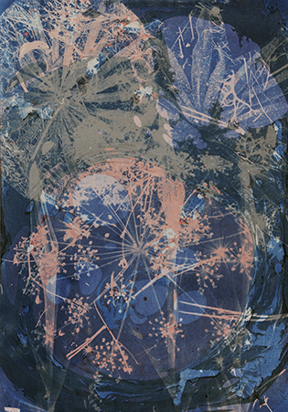 Tirage issu de la série, La partie pour le tout, collages papier et technique mixtes (cyanotype, marbrures) de Nina Reumaux, résidence de recherche et de création, le LAAB en collectif augmenté au Domaine des Boissets, Lozère, 2020.
