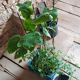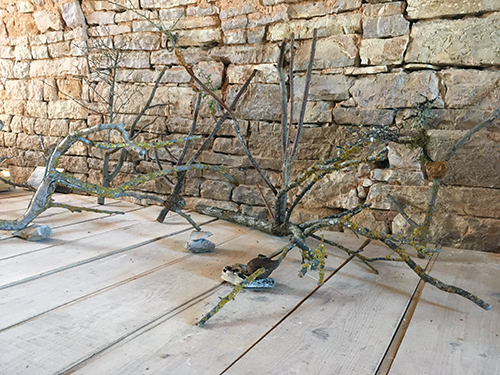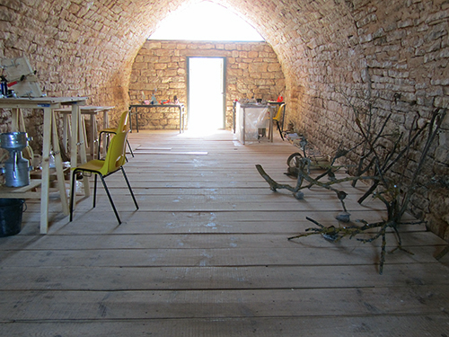 Vue d'atelier, à gaucheRefuge végétal, bois, argile, terre, cire d'abeille à l'état brut, ruban à greffer, Delphine Chevrot, résidence de recherche et de création, le LAAB en collectif augmenté au Domaine des Boissets, Lozère, 2020.
