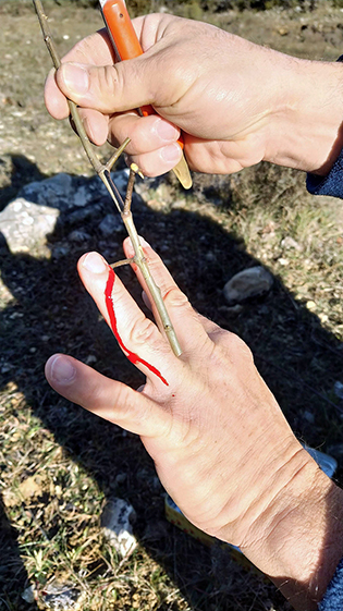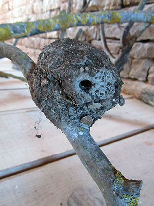 Refuge végétal, bois, argile, terre, cire d'abeille à l'état brut, ruban à greffer, Delphine Chevrot, résidence de recherche et de création, le LAAB en collectif augmenté au Domaine des Boissets, Lozère, 2020.