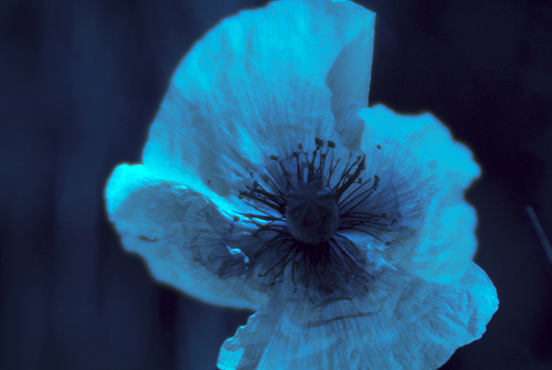 Coquelicot, photograhie UV réalisée avec un appareil dont le boitier a été défiltré pour y appliquer un filtre baader UV, Sabrina Issa, résidence de recherche et de création, le LAAB en collectif augmenté au Domaine des Boissets, Lozère, 2020.