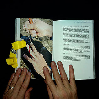 Prise de son réalisée sur des pierres calcaires du Causse, de Nicolas Bralet. Image © Sabrina Issa, édition L'Acte de la Greffe, la transitivité, du LAAB en collectif augmenté, 300 exemplaires accompagné de huits cartes postales, 2021.